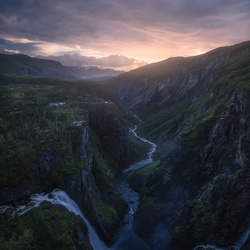 It´s a breathtaking view you are served when you walk out to the platform above Vöringsfossen. When I arrived a few hours before sunset after a 10 hour drive the place was packed with tourists and the steel platform was shaking from all the people and the sky was totally overcast. Snapped a few shots to check differnt compositions and perspectives. After a while a rainshower came in and solved the problem with too many people. Just in time for sunset the skies started to clear and I had the place all by my self.