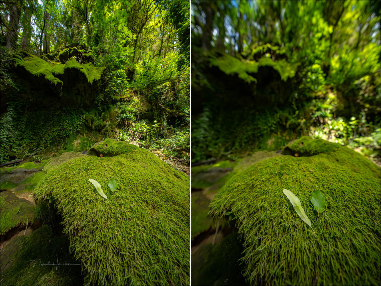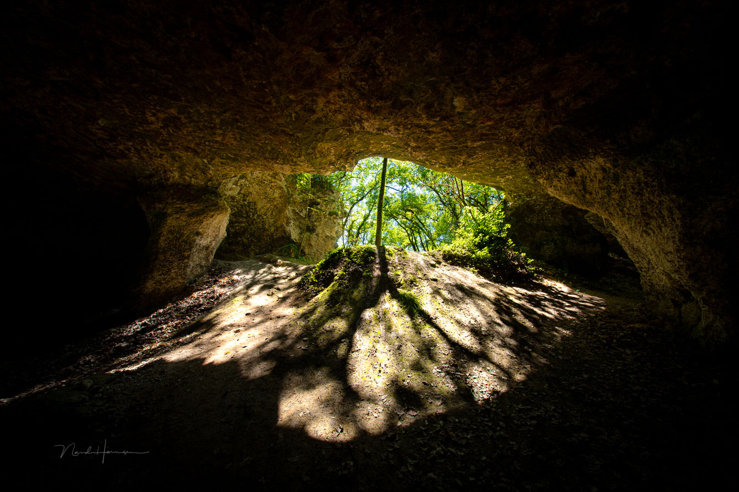 The lens shines in tight spots. Shooting a cave entrance was ideal with this lens, just like small open spaces in a forest or in-between rocks. Because there are almost no vertical lines in these situations, pointing the camera upwards or downwards is no problem.