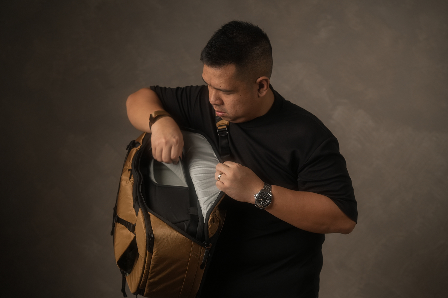 The 45L Travel Backpack was the first released in Peak Design’s modular system. While it has many similarities with the smaller 30L version, it also has a lot more features that might make a difference in how one travels, carries, and shoots. Both backpacks have a weather-resistant exterior shell that prevents the absorption and entry of moisture into the compartments even in moderate rain. Both backpacks come with straps on all sides that can be used as carrying handles, one on top, left, right, bottom, and on the back panel. The strap on the back panel doubles as a way to secure the backpack on top of rolling luggage whenever applicable. In addition, both backpack sizes have shoulder straps that conveniently slide into a pocket whenever they are not in use.