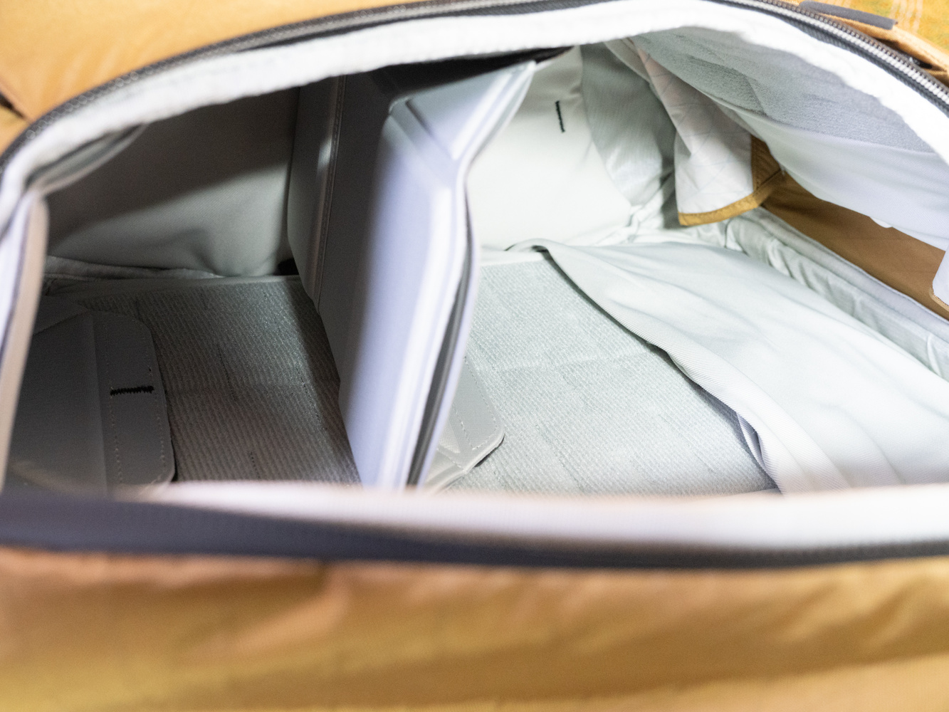 Like all PD bags, the internal sections of the bag are light gray, making it easy to see what you are looking for inside. It’s compartmentalized by three Velcro-secured, adjustable organizers. These can be raised and lowered, and folded in various ways to hold different-sized gear. They can also be removed completely.