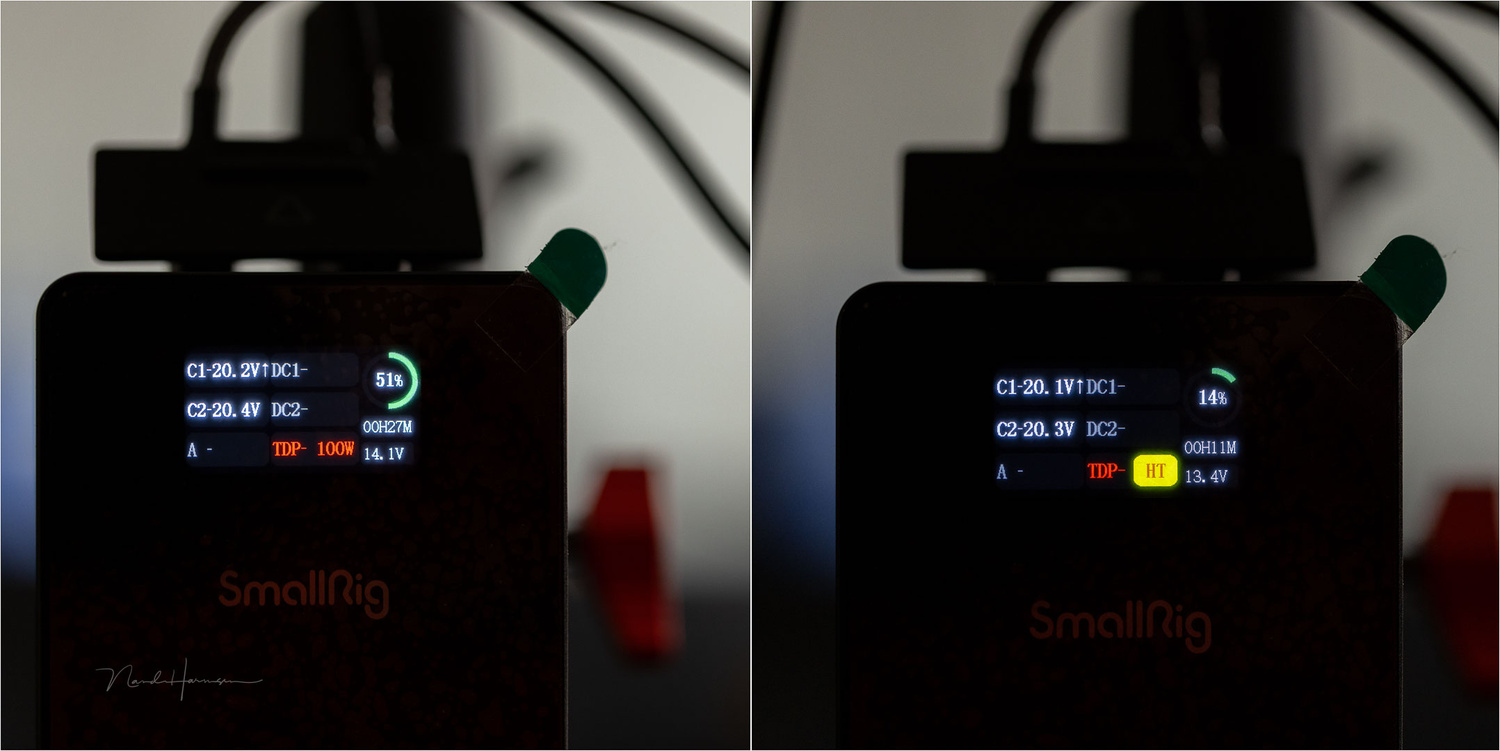 The OLED screen provides information about the amount of voltage per connection in use and the total wattage. If the total wattage reaches or exceeds the maximum 100 watts, the letters TDP (Total Discharge Power) will be highlighted in red. If the battery reaches 45 degrees Celsius, a yellow HT (High Temperature) warning lights up. There are also warning signals for low temperature, over-current, and over-voltage.