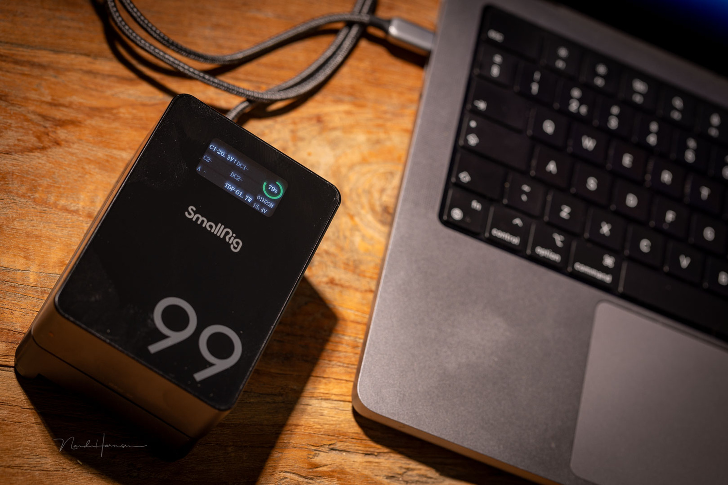 Thanks to its connections, the SmallRig VB99 Pro also functions as a power bank. The capacity is large enough to charge a 14-inch MacBook Pro completely or multiple devices at once.