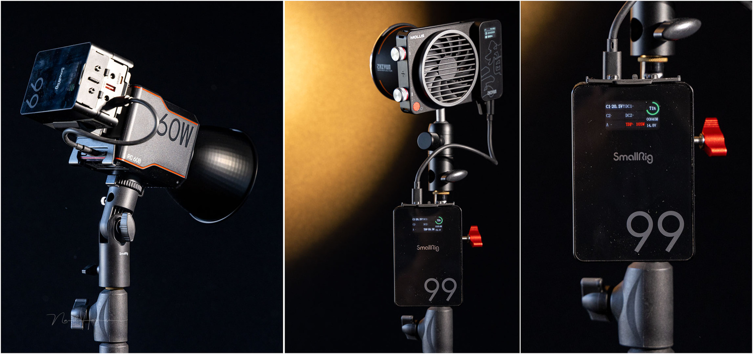 The battery can also power a video light, such as the SmallRig RC 60B COB LED light or the Zhiyun Molus X100. The latter allows for the maximum 100-watt output on the SmallRig VB99 Pro battery for more than 40 minutes. For comparison, the original Zhiyun battery offers only 30 minutes of power.