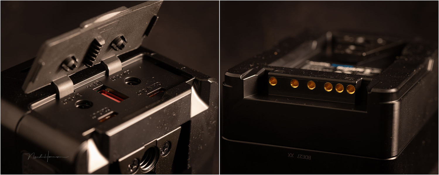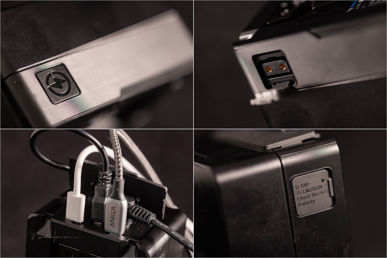 The battery can be charged through the D-tap connector or the USB-C port. If the latter is used, the battery can be charged with a 100 W GaN fast charger in approximately 2.5 hours. It is possible to use the battery while charging.